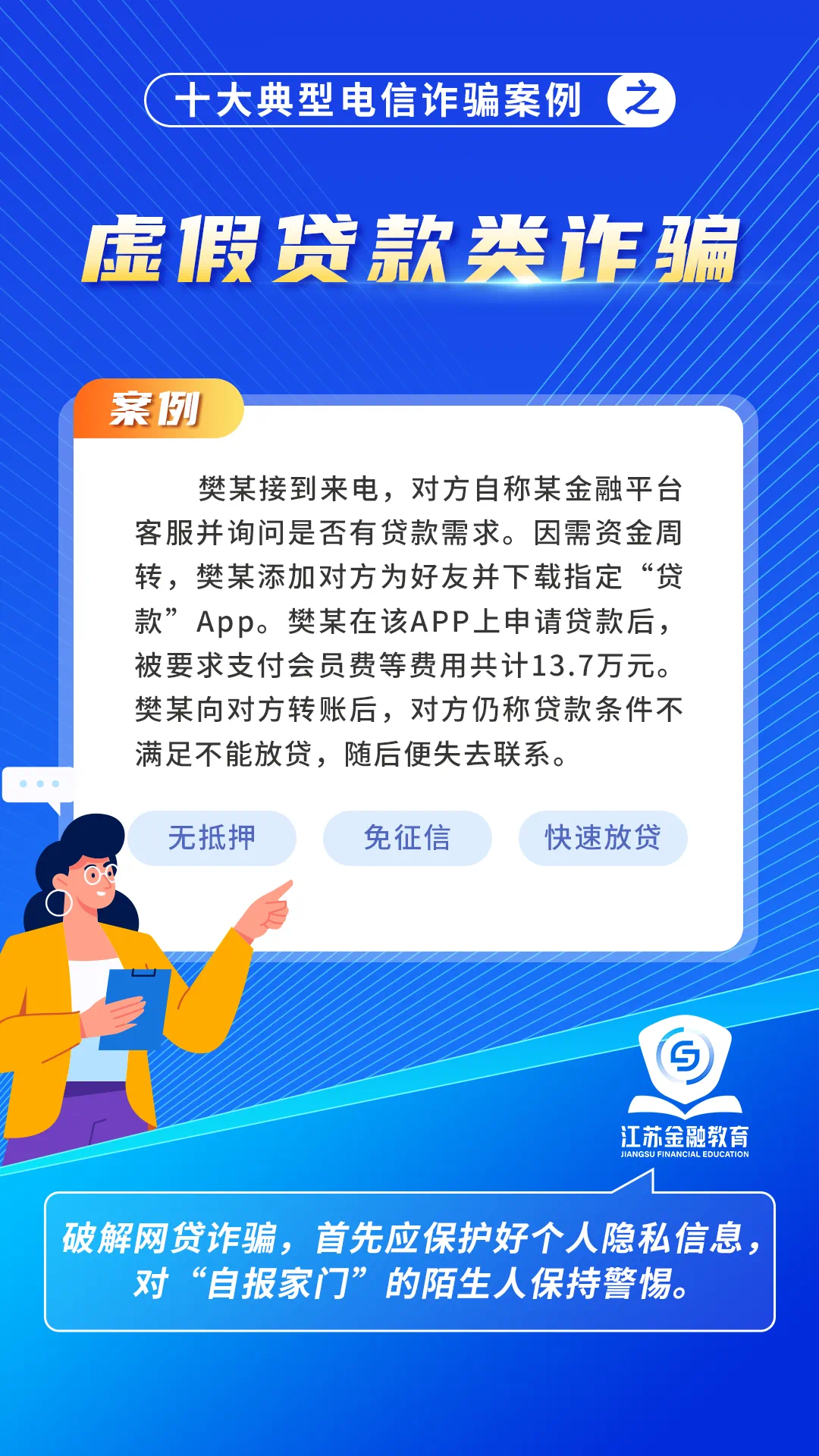 2024年江蘇“金融教育宣傳月”活動啟動儀式中,發布了十大典型詐騙案例,涵蓋了刷單返利、虛假網絡投資、虛假貸款等多種類型。以案例深刻剖析詐騙手法,提醒民眾警惕各類騙局,提高防騙意識,保護財產安全。