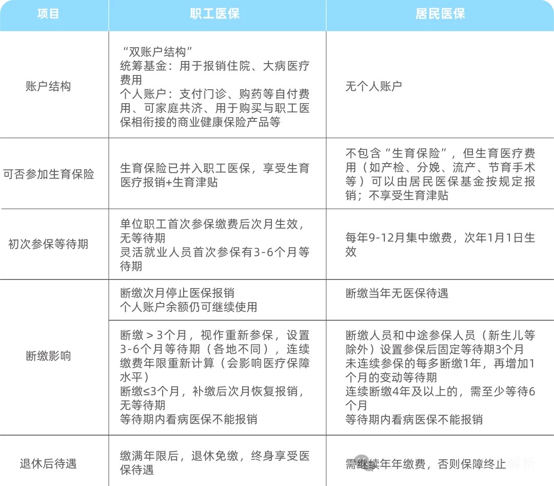 職工醫保:上班族的醫保,單位幫你交,保障更全面,門診+住院都有報銷,退休后待遇穩定,適合長期打工人。